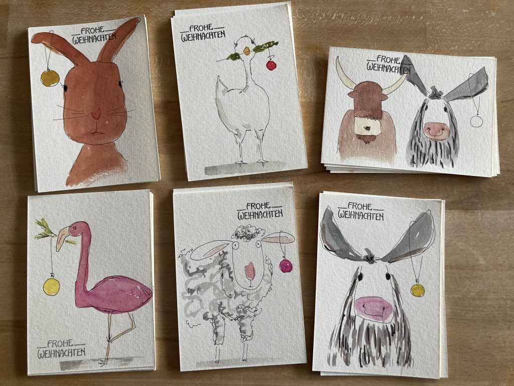 Für Weihnachten gibt’s neue Postkarten von mir… in 6 Motiven, Tuschezeichnung und Aquarell…